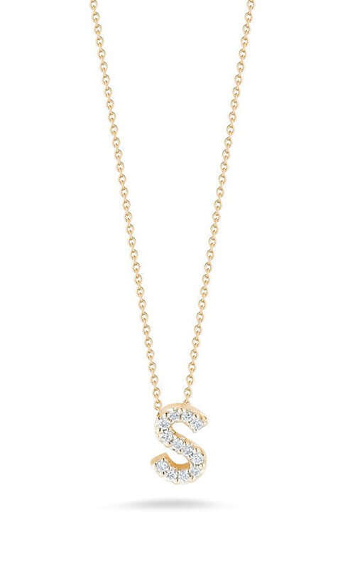 Roberto Coin Love Letter S Pendant Yellow Gold and Diamonds. 18kt yellow gold pendant with letter A featuring 0.05ct of diamonds. Signature ruby detail inside. Length 18 inches.